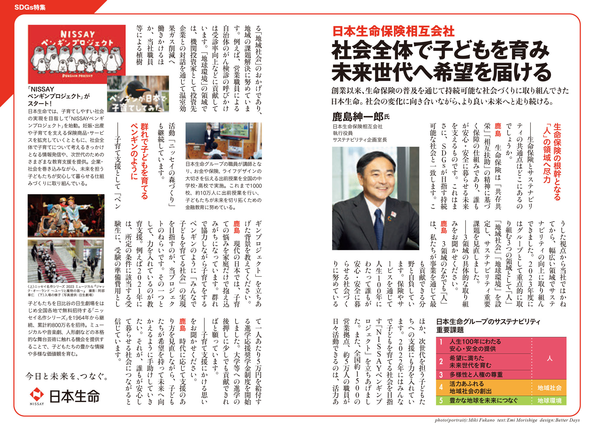 2023年12月、日本生命保険相互会社の鹿島執行役員と新谷との対談動画を公開しました。社会全体で子育てについて考えるための情報発信「NISSAYペンギンプロジェクト」など日本生命が取り組むSDGs課題について、新谷が深堀りしていく対談動画です。