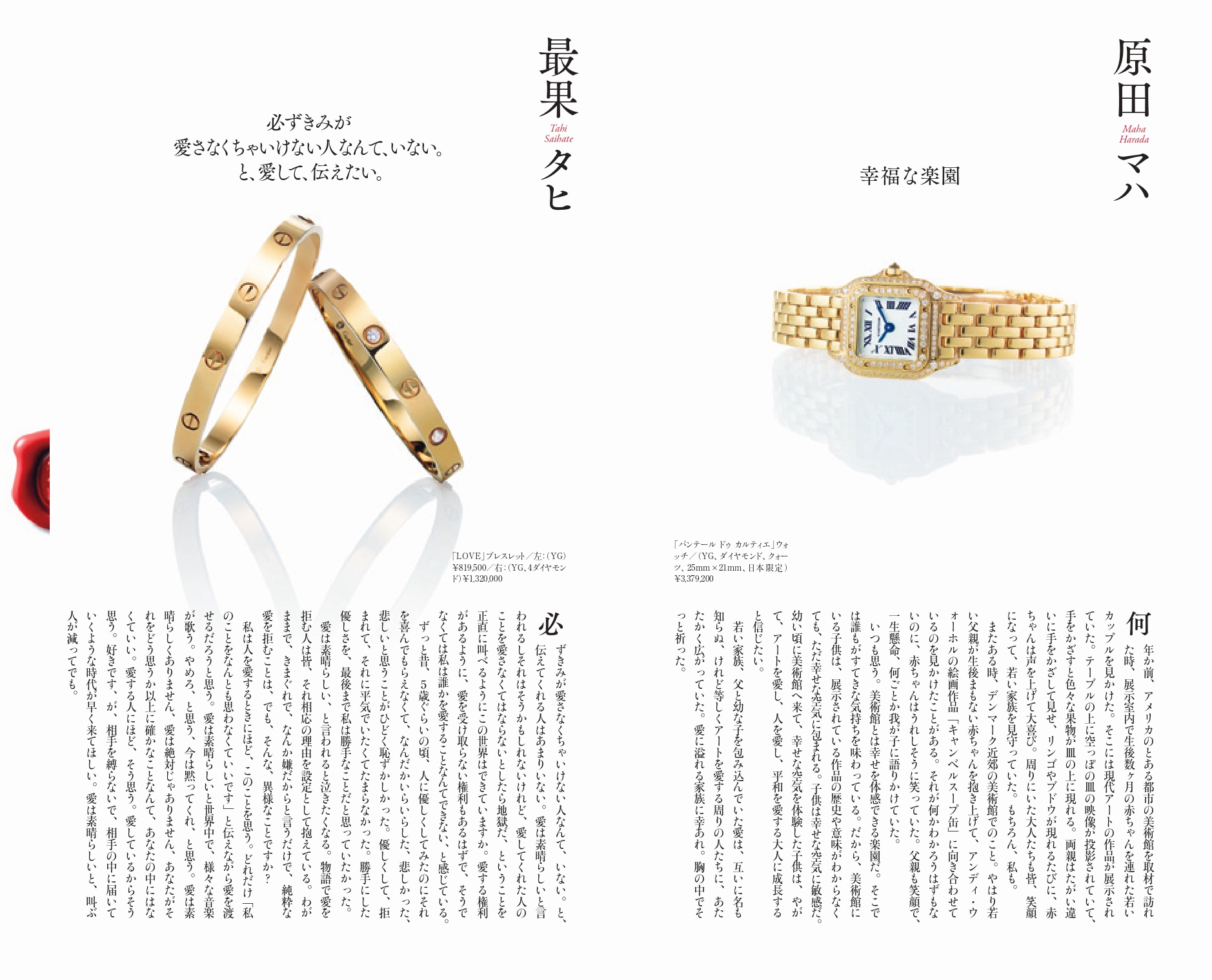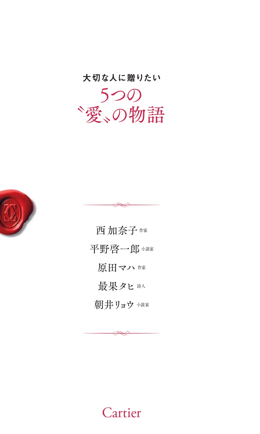 今回ご紹介するカルティエ様とのタイアップ企画では、ホリデーキャンペーンに合わせて西加奈子さん、平野敬一郎さん、原田マハさん、最果タヒさん、朝井リョウさんの5名の豪華作家に、「愛」をテーマにエッセイを執筆いただきました。