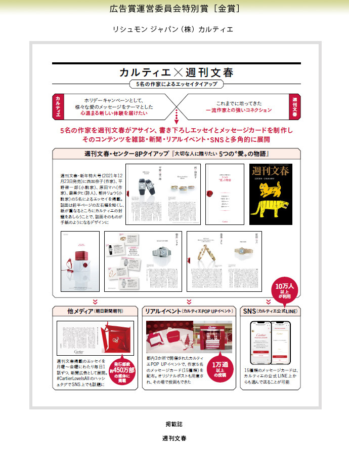本企画の包括的な展開が評価され、第64回日本雑誌広告賞にて、立体的、多面的展開など特に企画性の高い広告作品に対し贈られる広告賞運営委員会特別賞の金賞を受賞しました。