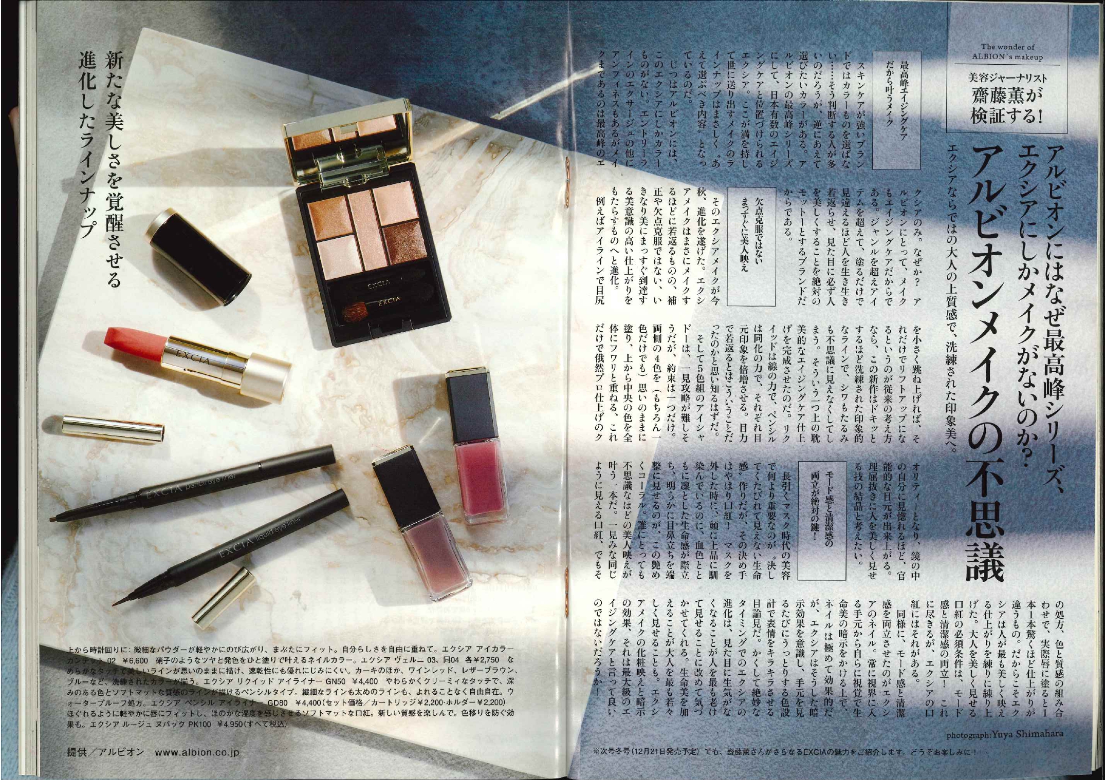 アルビオン様のエイジングケアブランド、エクシアにおいては2誌でそれぞれ2回タイアップを行いました。ちょうどコロナが明けがだしたタイミングで、「もう一度メイクをして外に出かけよう」というポジティブなメッセージを込めて誌面を制作いたしました。