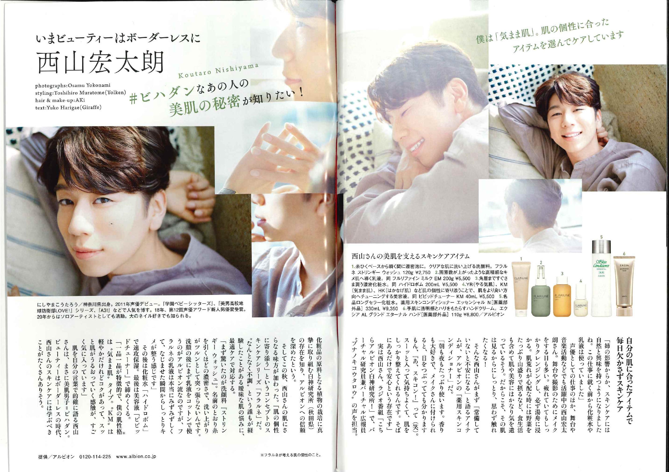 こちらの事例では表4と表3に広告を掲載し、後ろ拍子からの”雑誌ジャック風タイアップ”。美容好きとして知られる声優の西山宏太朗さんにご出演いただき、アルビオン様のスキンケアの魅力を紹介していただきました。また、姉妹誌CREAでも同時にタイアップ出稿。インタビューも掲載し、それぞれの異なる読者層に訴求できたパターンです。
